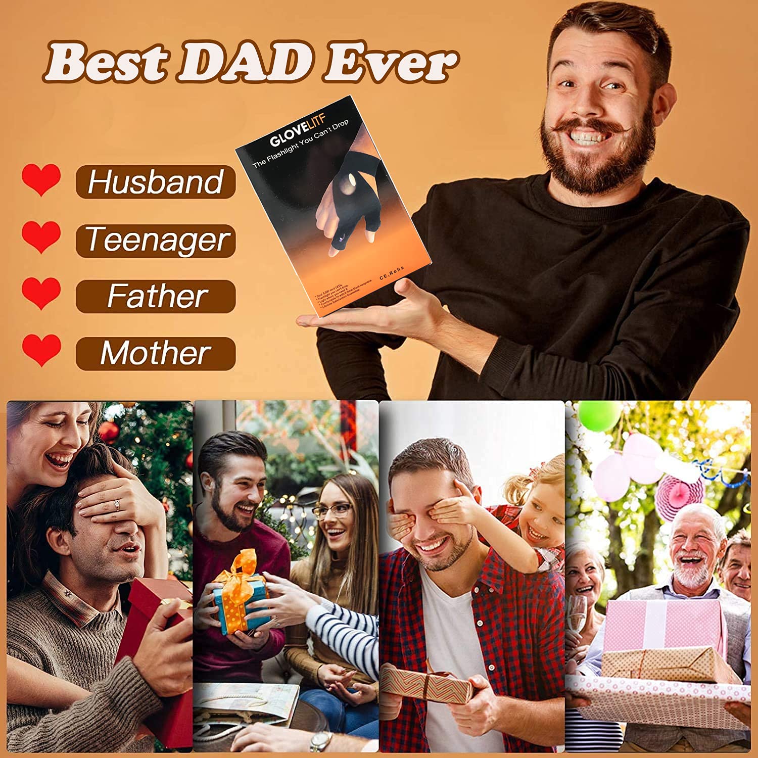 - LED lights on fingertips for hands-free use